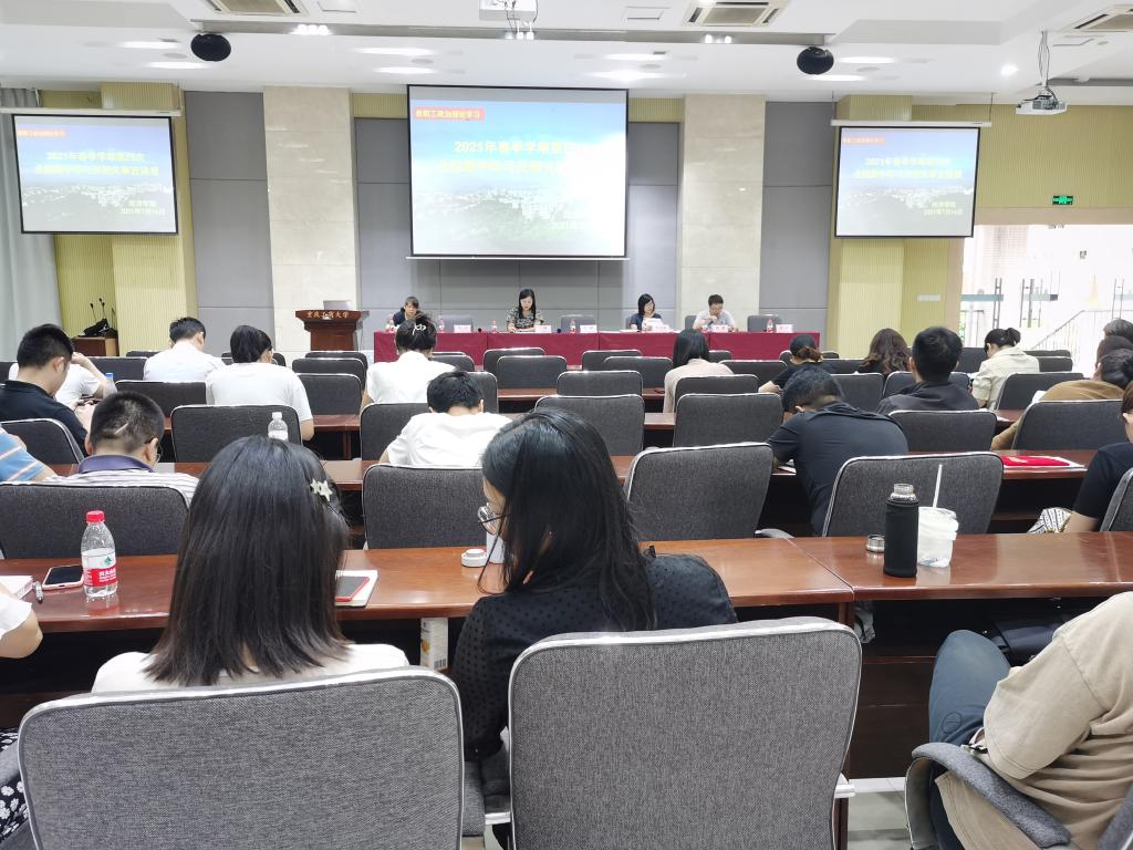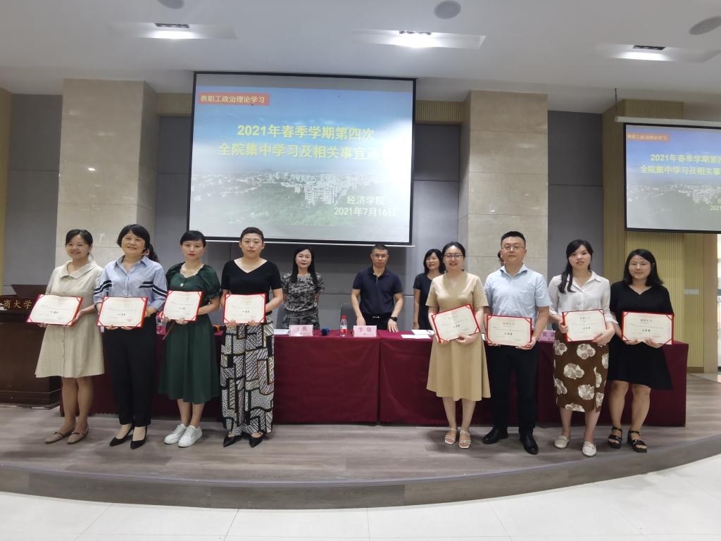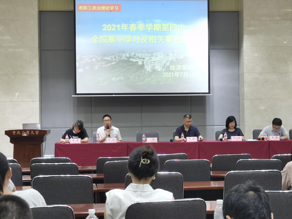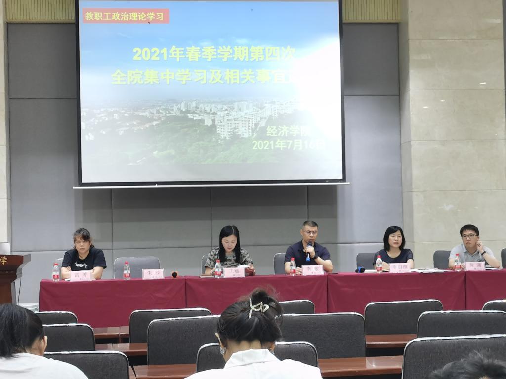 会议伊始,学院党委书记李自维对学院本学期工作作了全面总结,重点阐述了党建、教学、科研、学生工作等方面的亮点和成绩,对大家的辛勤付出表示诚挚的感谢。她强调学院党委、教师的政治理论学习仍需加强,不断深入学习党史学习教育,并做好学习教育向为群众办实事的成果转化。接着,教学副院长朱沙从一流课程建设及一流专业建设等方面进行了回顾,并对下学期相关工作做了重点部署及安排。黄潇副院长带领全体教职工学习了习近平总书记的重要讲话精神,他要求各位老师一定要认真学习,深刻领会,把重要指示、相关文件、会议精神贯彻到自己的工作中。王燕副书记从beat365官方网站就业工作、经济论丛、学生三下乡实践活动等方面展开介绍,同时告知学生工作主要工作节点,提醒相关老师做好相应准备。