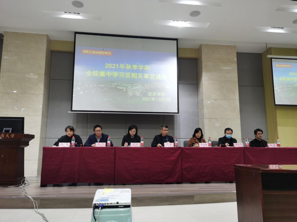 会上,李自维领学了党的十九届六中全会精神。她从三个历史决议、四个“伟大成就”、三个“需要”、两个“确立”、三次历史性“飞跃”、十个“坚持”、一个根本及四个“必须”等八方面全面深入地解读了全会精神。她强调,党的十九届六中全会是在党的百年华诞之际召开的一次重要会议,承前启后,继往开来,是一篇在新的历史交汇点接续奋斗、砥砺前进的纲领性文献。李自维强调,认真学习宣传贯彻全会精神是学院当前及今后一个时期首要的政治任务,全院师生要从“学懂弄通做实”入手,确保全会精神入脑入心,落地落实。首先,要面向师生抓学习。全院上下要迅速行动起来,特别是十三个基层党支部及学生各班级,要在院内迅速兴起学习宣传贯彻全会精神的热潮;其次,要利用优势抓研究。充分发挥好应用经济学重庆市一流学科和学院人才优势,要科学把握全会精神的内涵实质,全力做好全会精神学习宣传和研究阐释,积极服务党的理论创新工作;第三,要结合实际开新局。要把全会精神与全面贯彻党的教育方针相结合,与加快学院“双一流”建设相结合,紧密结合学院、各系部等改革发展中的工作实际,推动全面从严治党,落实“三全育人”,推动beat365官方网站高质量发展。第四,要聚焦就业抓育人。要提高政治站位,全面统筹领导,打好“三全育人”组合拳,高度重视人才培养质量,切实分析研讨并做好每年的招生就业工作,坚持“三位一体”工作理念,完善“三全育人”工作体系,构建多层次宣传体系,拓宽毕业生就业渠道。