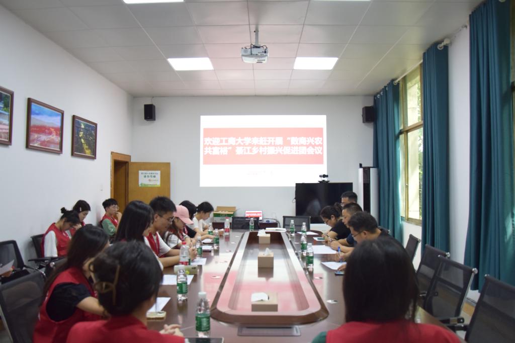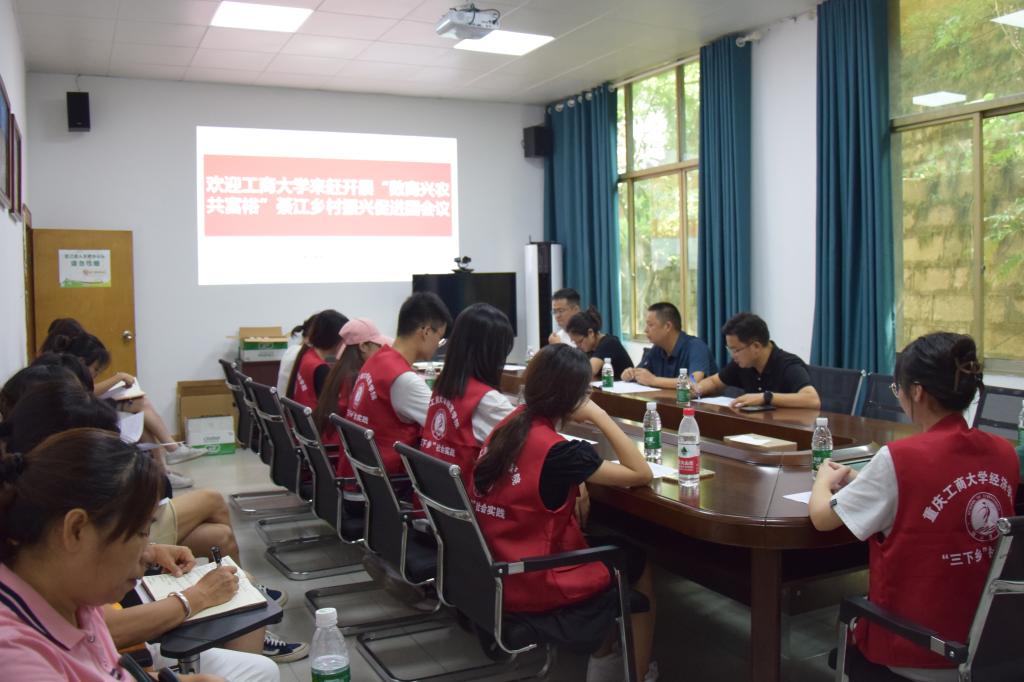 为深入学习宣传贯彻习近平新时代中国特色社会主义思想和党的十九届六中全会精神,贯彻落实习近平总书记关于青年工作的重要思想,深入学习习近平总书记在庆祝中国共产主义青年团成立100周年大会上的重要讲话精神,坚定信念听党话、跟党走,迎接党的二十大胜利召开,beat365官方网站号召、组织全院学生开展2022年大学生志愿者暑期“三下乡”社会实践活动。2022年7月8日下午beat365官方网站“数商兴农共富裕”綦江乡村振兴团走进綦江区赶水镇开展乡村振兴社会实践活动。赶水镇党委书记赵亮、镇长龚钦龙、官田村书记若任天伟、石房村书记张祥文、南坪村书记周在忠、盐河村书记罗德均、双龙村书记王梅以及麻柳村书记游永秀负责对接并参与此次启动会,鄢金宏副镇长主持会议。