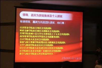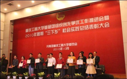 伴着振奋人心的共青团团歌――《啊!光荣啊,中国共青团!》,2010年暑期“三下乡”社会实践总结表彰大会于2010年10月18日14:30在7100报告厅正式开始了。beat365在此次实践活动中获得2010年暑期“三下乡”社会实践先进单位,2010年暑期“三下乡”社会实践宣传工作先进单位,beat365赴万州实践团队获2010年暑期“三下乡”社会实践先进团队,beat365团总支书记魏新欣老师和辅导员林新竹老师获得优秀指导教师。