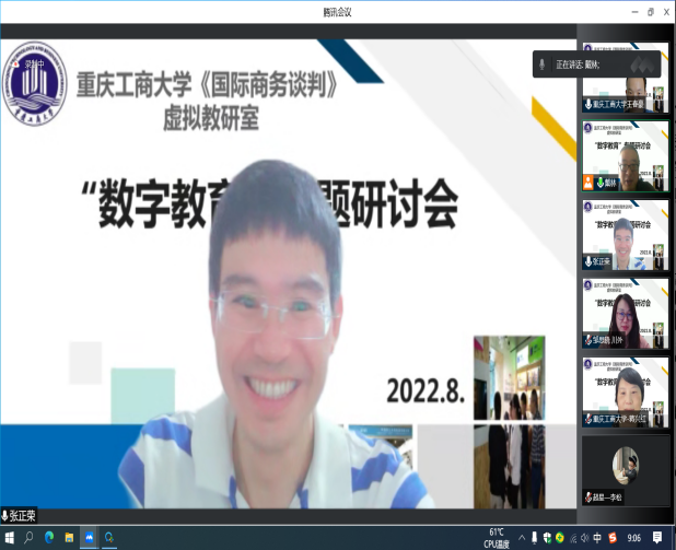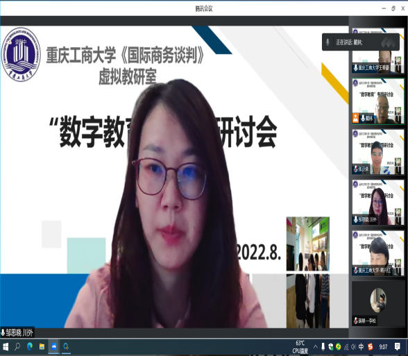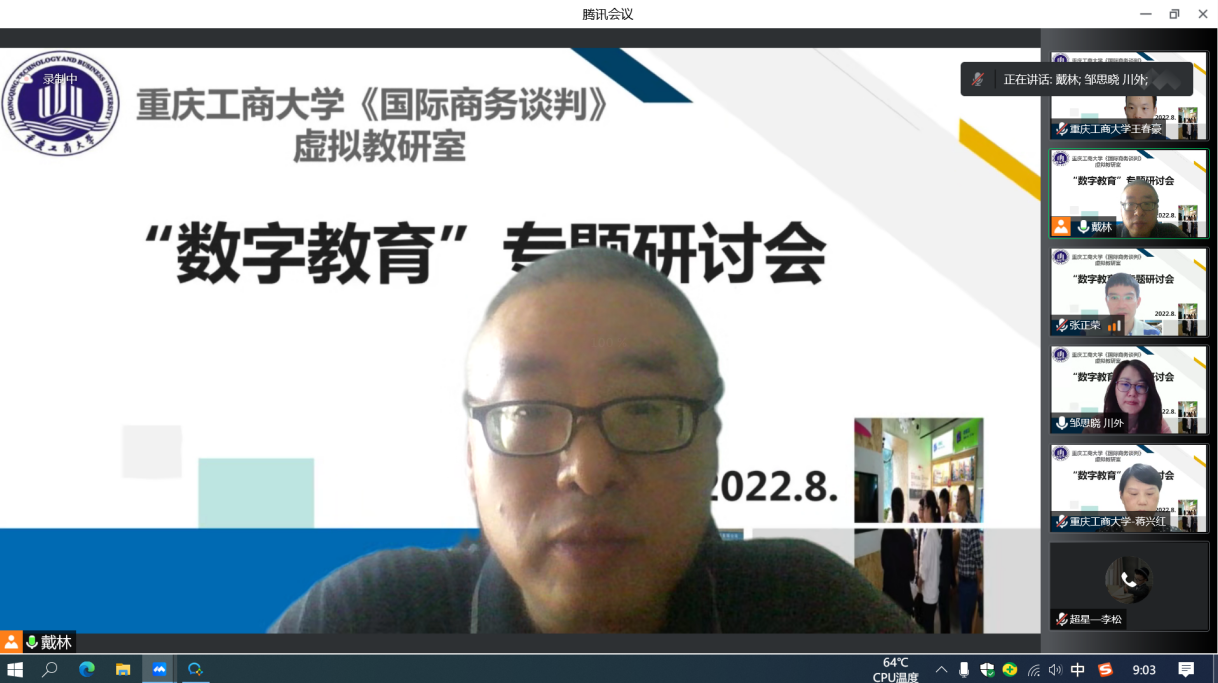 2022年8月19日,beat365官方网站校级虚拟教研室,《国际商务谈判》虚拟教研室“2022数字教育专题研讨会”在腾讯会议平台成功举办,会议由教研室负责人戴林副教授主持,校外成员浙江理工大学管理学院跨境电子商务研究所所长张正荣、四川外国语大学国际金融与贸易学院国际经济与贸易系主任邹思晓以及校内成员蒋兴红、王春豪、冉梨等老师参加了会议,特邀超星公司李松、张秋林和刘文静老师参加研讨。