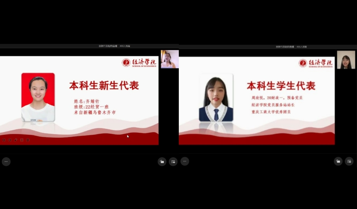 随后,本科学生代表和新生代表先后发言。20级财政学专业周欣悦同学结合自己的学习感悟,向学弟学妹们分享了三点经验:一是要提前做好学习规划,高度重视专业课程;二是注重知识的深度,提高专业素质;三是培养自己的兴趣爱好,大胆尝试新的领域,成为学才兼备的综合性高素质人才。22级经贸类一班齐婧竹同学则代表2022级新同学表示,作为beat365官方网站的新生,定会不忘初心,以充沛的生命力迎接未来的各种机遇与挑战,昂首阔步,无畏向前。
