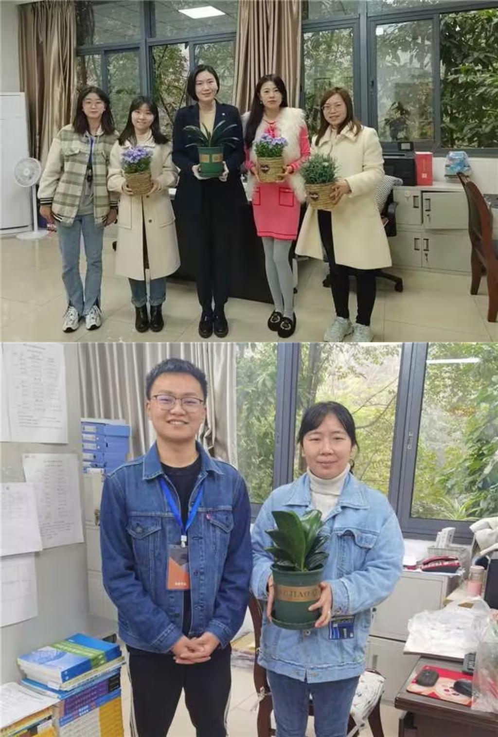 上午十点,献花活动正式开始。学生助理们利用课间时间将鲜花盆栽搬到办公室,分成若干小组为李自维书记,宋瑛院长,雷菁组织员,尹元福副院长,白海龙副书记以及各个办公室的老师献上鲜花盆栽,并合影留念。献花过程中,每位老师都真切地感受到了学生助理们浓浓的情意,老师们接过鲜花,不仅是惊喜和感动,更多的还是幸福。朵朵鲜花传真情,句句祝福暖师心。当芬芳的鲜花和老师们的笑脸融汇在一起,办公室里洋溢的是一片温馨和甜蜜。