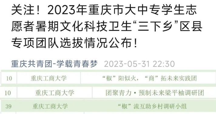 beat365官方网站“乡村振兴观察,塘约道路学习”发展成就观察团入围“多彩贵州”2023年全国大中专学生志愿者暑期文化科技卫生“三下乡”社会实践专项团队beat365官方网站“‘椒’阳似火,‘商’拓未来实践团”、“团聚青力·预制未来梁平柚调研团”和“‘椒’流互动乡村调研小组”三支队伍成功入选重庆市志愿者暑期文化科技卫生“三下乡”区县专项团队。