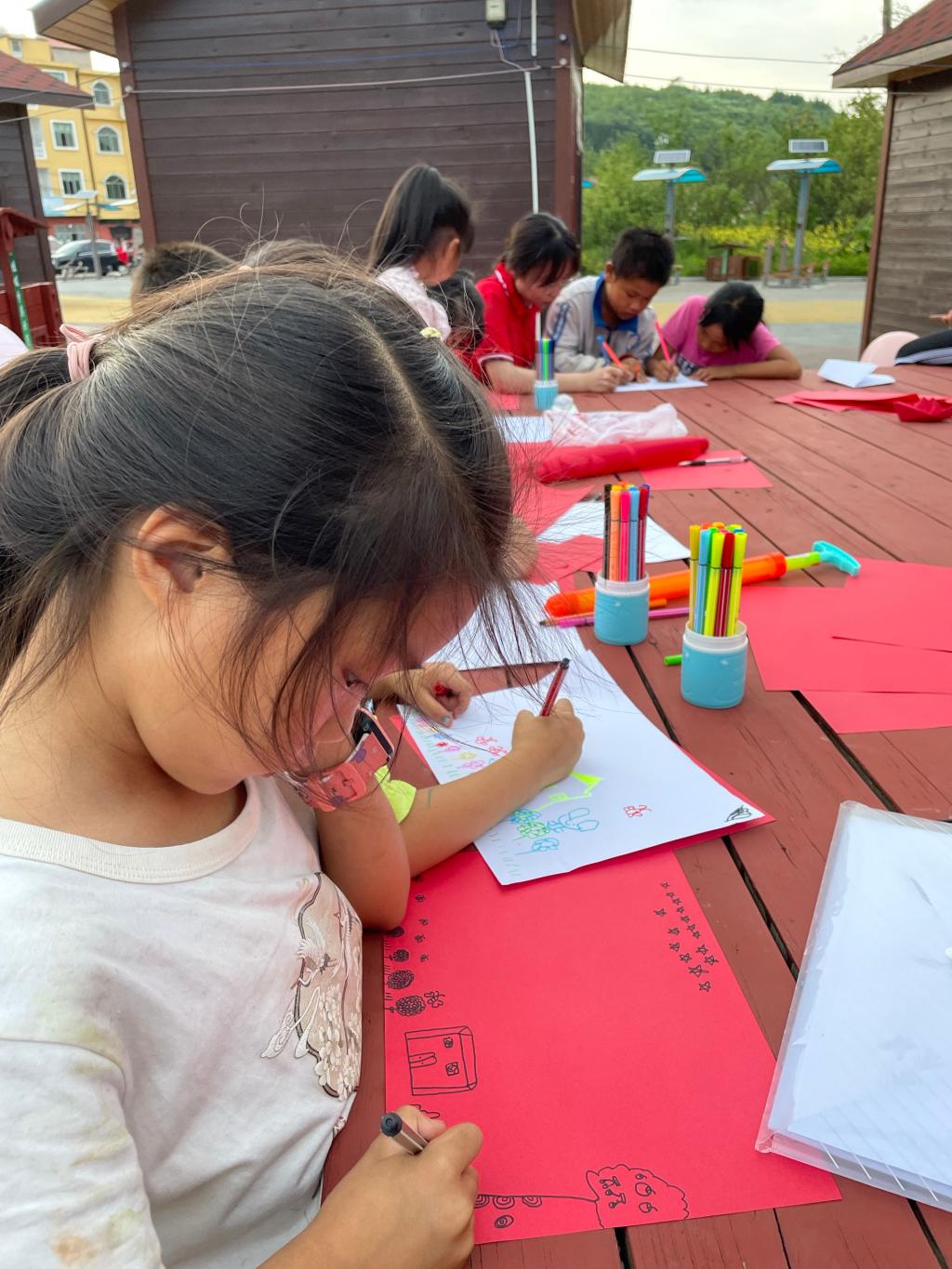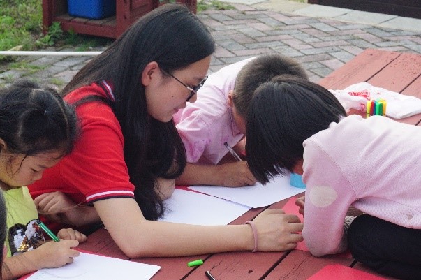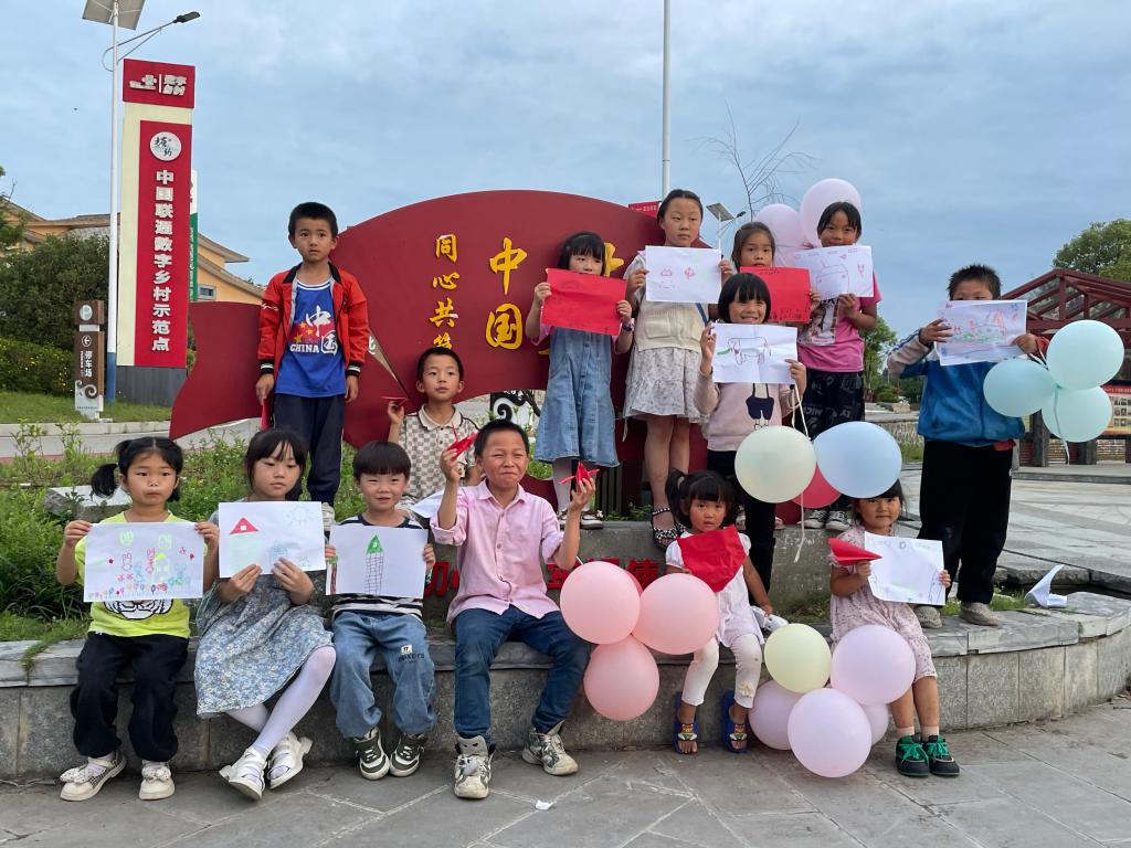随后,观察团成员拿出准备好的纸张和水彩笔,带领小朋友开展“我是小画家——我为乡村绘制明信片”活动。“小朋友们来一起唱,我是小小画家,画画本领大,左一笔,右一笔,七彩的魔法。”活动现场,观察团成员周川会一段趣味十足的《小小画家》手势舞赢得小朋友们的欢声笑语。紧接着,观察团成员张子璇为孩子们讲解了基本的绘画知识,例如如何勾勒出绘画作品的轮廓和如何选择颜色搭配等,鼓励小朋友们积极动手创作。在她的细心讲解下,现场的小朋友们有模有样地纷纷投入到“创作”中,通过各种线条、颜色来表达他们所看到的、感觉到的、想到的……在绘画过程中,观察团成员时刻关注着孩子的绘画作品,并且在他们产生疑惑的时候进行答疑;不一会儿,各种各样的绘画作品从小朋友们的手中创作出来,他们纷纷举起自己的“作品”,脸上是满满的自豪。通过本次活动,小朋友们在体验动手动脑的乐趣的同时,也激发了绘画创作的灵感与热情,体会了到艺术创造带来的乐趣。最后,观察团成员带领小朋友们在村民文化广场上折纸,教小朋友们打篮球、跳舞,这不仅丰富了他们的暑期生活,也在寓教于乐中拓宽了他们的视野。
