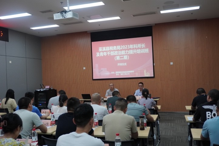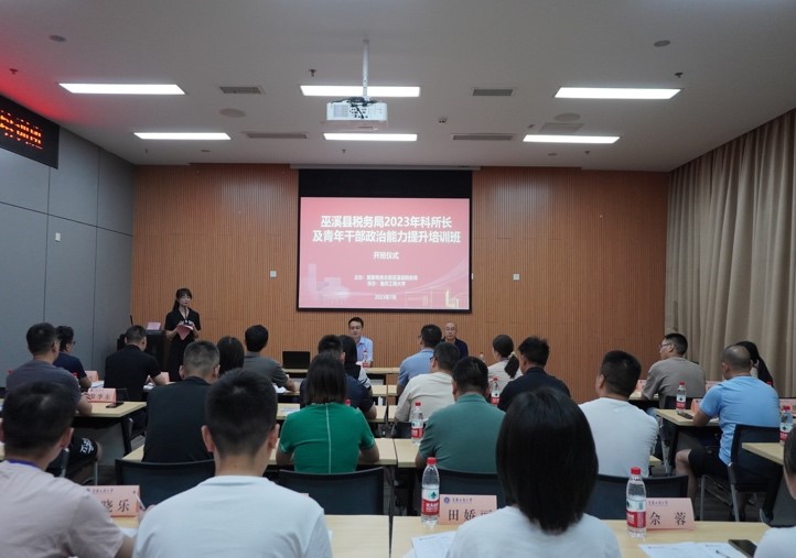 为适应新形势下税收高质量发展工作需要,全面贯彻落实“人才兴税”战略,打造一支政治、思想、能力、作风全面过硬的高素质干部队伍。由国家税务总局巫溪县税务局主办、beat365官方网站承办的两期“2023年科所长及青年干部政治能力提升培训班”分别于2023年7月23日——2023年7月29日、2023年7月30日——2023年8月5日在beat365图书馆会议中心二会议室顺利举行。beat365官方网站党委常委、统战部常务副部长陈松出席开班仪式;国家税务总局巫溪县税务局党委书记、局长刘睿,国家税务总局巫溪县税务局党委委员、纪检组组长黄鑫分别出席两期开班仪式。国家税务总局巫溪县税务局82名科所长及青年干部参加此次培训。