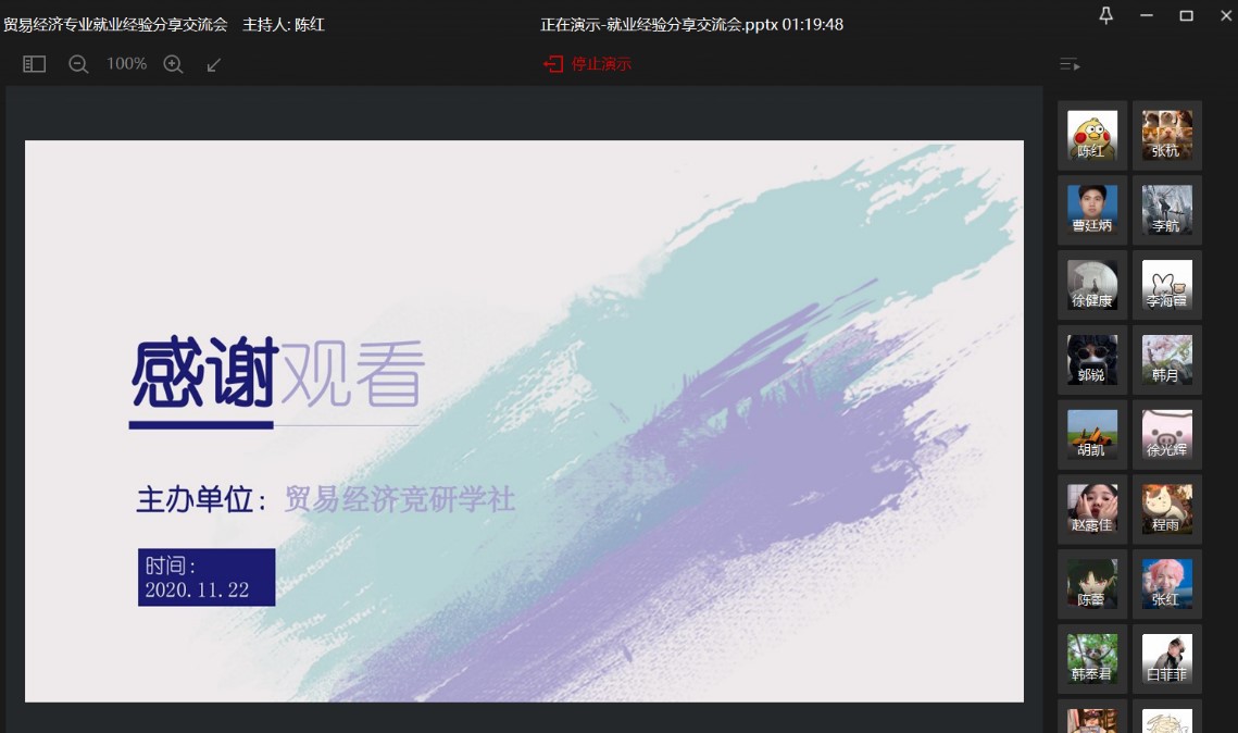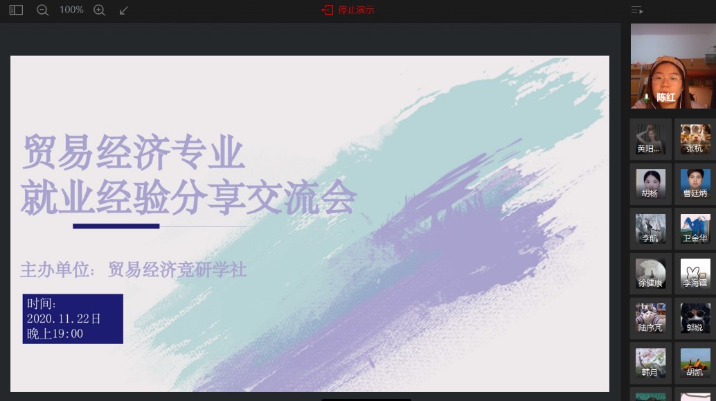 为帮助beat365官方网站贸易经济专业学生更好地了解求职就业的相关信息,解答就业路上的诸多疑惑,树立正确的就业观,择业观,提升贸易经济专业学生求职技能与职业素质。11月22日晚上,贸易经济竞研学社在企业微信上成功举办了线上就业经验分享交流会。本次交流会主要面向18级贸易经济专业全体学生,17级贸易经济专业优秀学长曹廷炳作为会议特邀主讲嘉宾出席了本次会议。