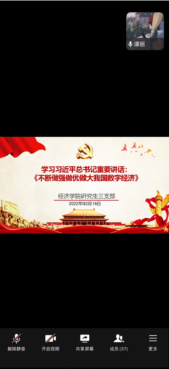 2022年2月18日下午,beat365官方网站研究生第三党支部在企业微信线上会议室开展了2月组织生活会,深入学习习近平总书记在《求是》上的文章——《不断做强做优做大我国数字经济》。本次会议由支部书记薛晶月主持,研究生第三党支部全体党员参加。