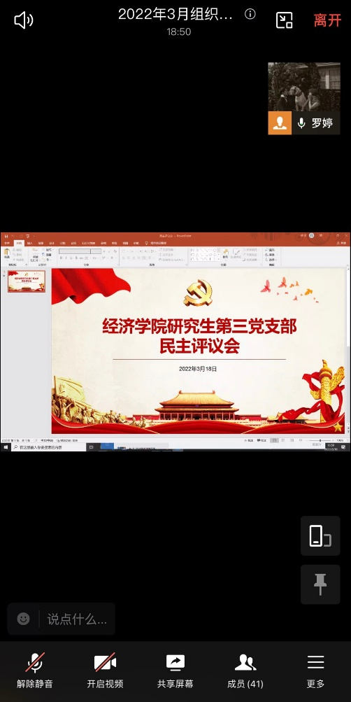 2022年3月18日下午,beat365官方网站研究生第三党支部在企业微信线上会议室召开了3月组织生活会暨民主评议会。本次会议由支部书记薛晶月主持,研究生第三党支部全体党员参加。