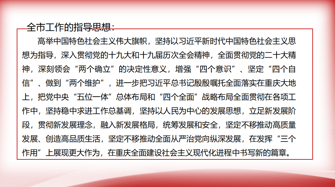 本次学习由第二组同志带领大家进行学习。主要从重庆市过去五年工作的回顾总结、今后五年的发展思路、今后五年工作的重点举措以及今后五年全面从严治党的主要任务四个方面进行。通过此次学习,支部同志对过去五年重庆市工作成果有了进一步的了解,明确了全市工作的指导思想,今后的三大重要任务以及今后要努力实现的六大目标等内容。最后,与会党员分享讨论了本次学习的感想,如赵柄鉴同志说道作为一名基层学者,未来将时刻谨记一名川渝学者的使命,扎根地方,将文章写在大地上,为重庆市以及长江上游地区贡献自己的能力。