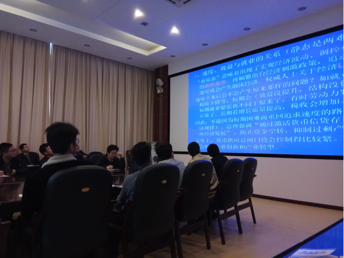 在学术交流过程中,郑老师以“新常态”经济的特征为背景,分析了经济新常态出现的原因,然后分别对速度、效益与就业的关系、政府与市场:市场在资源配置中起决定性作用、所有制结构:从“长子”到“双胞胎”、公司治理结构改革、财税、金融体制:渐进改革和“双轨制”、高管“天价”薪酬:企业改革和经理市场、资本市场发展的若干理论问题、城镇化:以人为中心还是以土地为中心等经济热点问题进行了讨论。