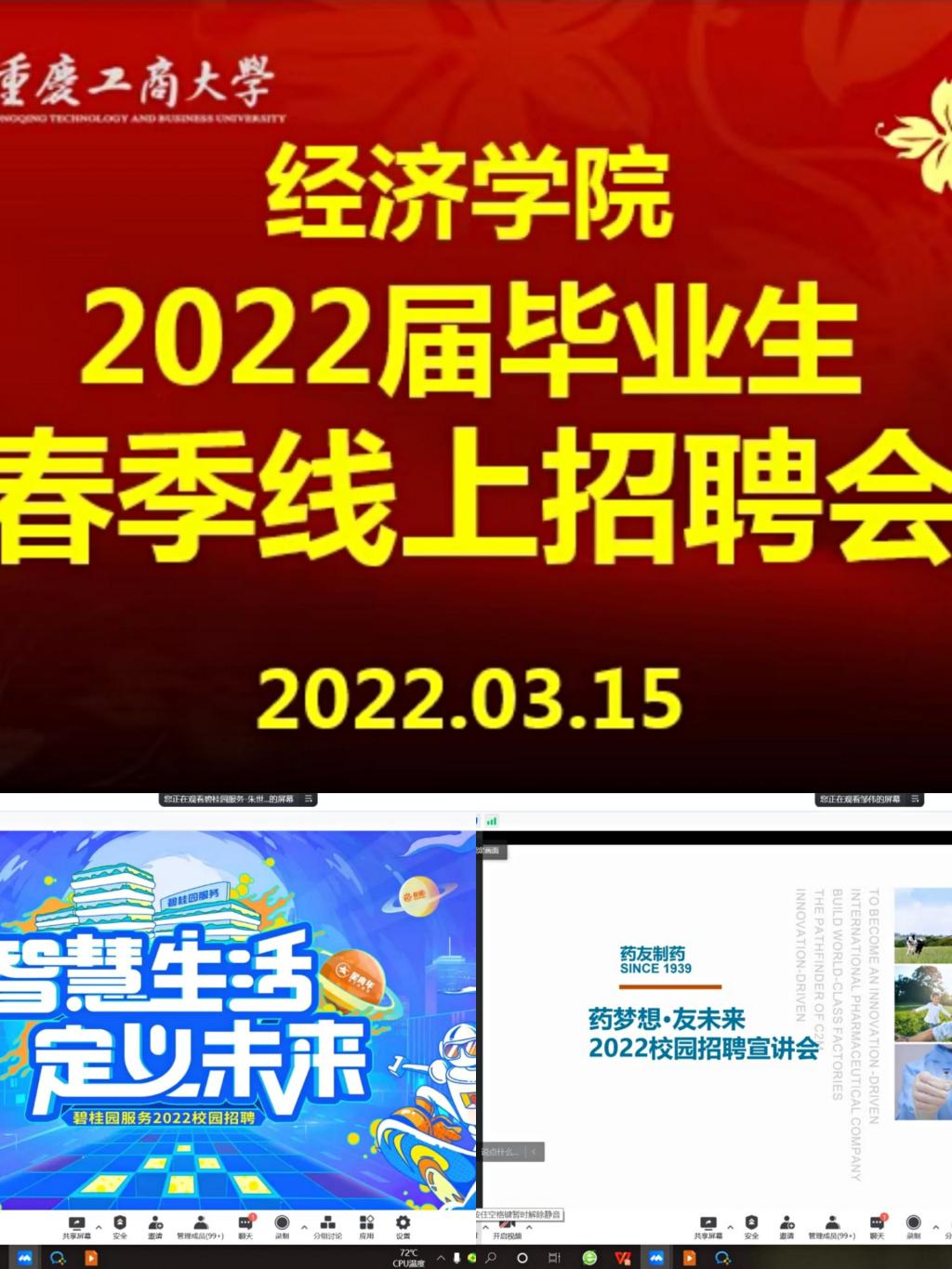 近日新冠疫情严峻,2022届毕业生就业面临巨大挑战。beat365官方网站“以学生为中心”,积极拓展“校友就业资源”,并立足疫情防控要求,搭建空中网络就业平台,召开“经济学院2022届毕业生春季线上招聘会”。为筹办此次线上招聘会,beat365官方网站在寒假和开学期初,积极准备,发动各班辅导员通过线上联络方式,把学院发展情况,毕业生情况推送到到校友微信群,积极联系校友企业,3月15日下午2点,beat365官方网站“2022届毕业生春季线上招聘会”共邀请药友制药、中信建投证、碧桂园生活服务集团、新大正物业、厦门豪客来科技有限公司、集泰股份等14家校友单位参加了此次招聘会。beat365官方网站领导、毕业班辅导员和14家企业HR高管以及160余名学生参加了此次招聘会。