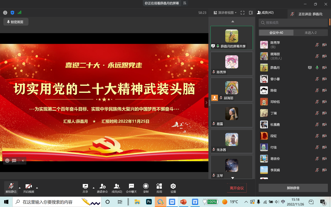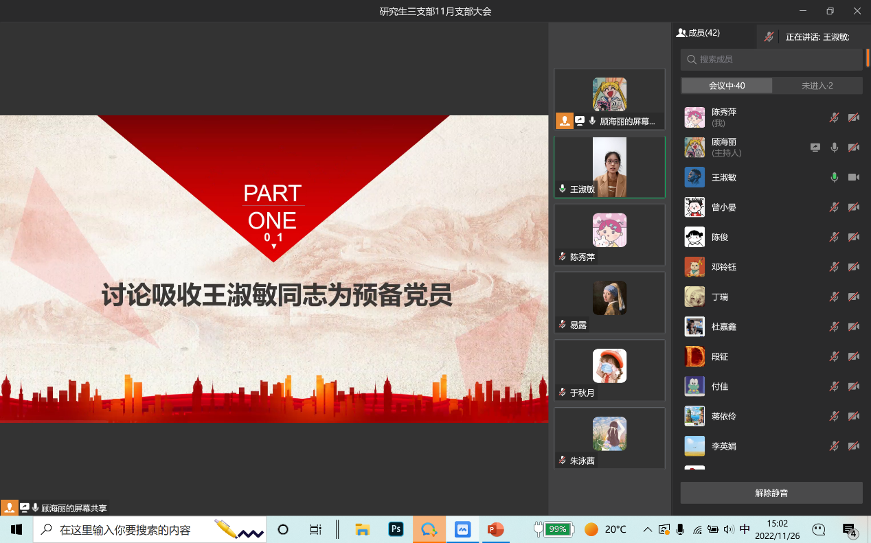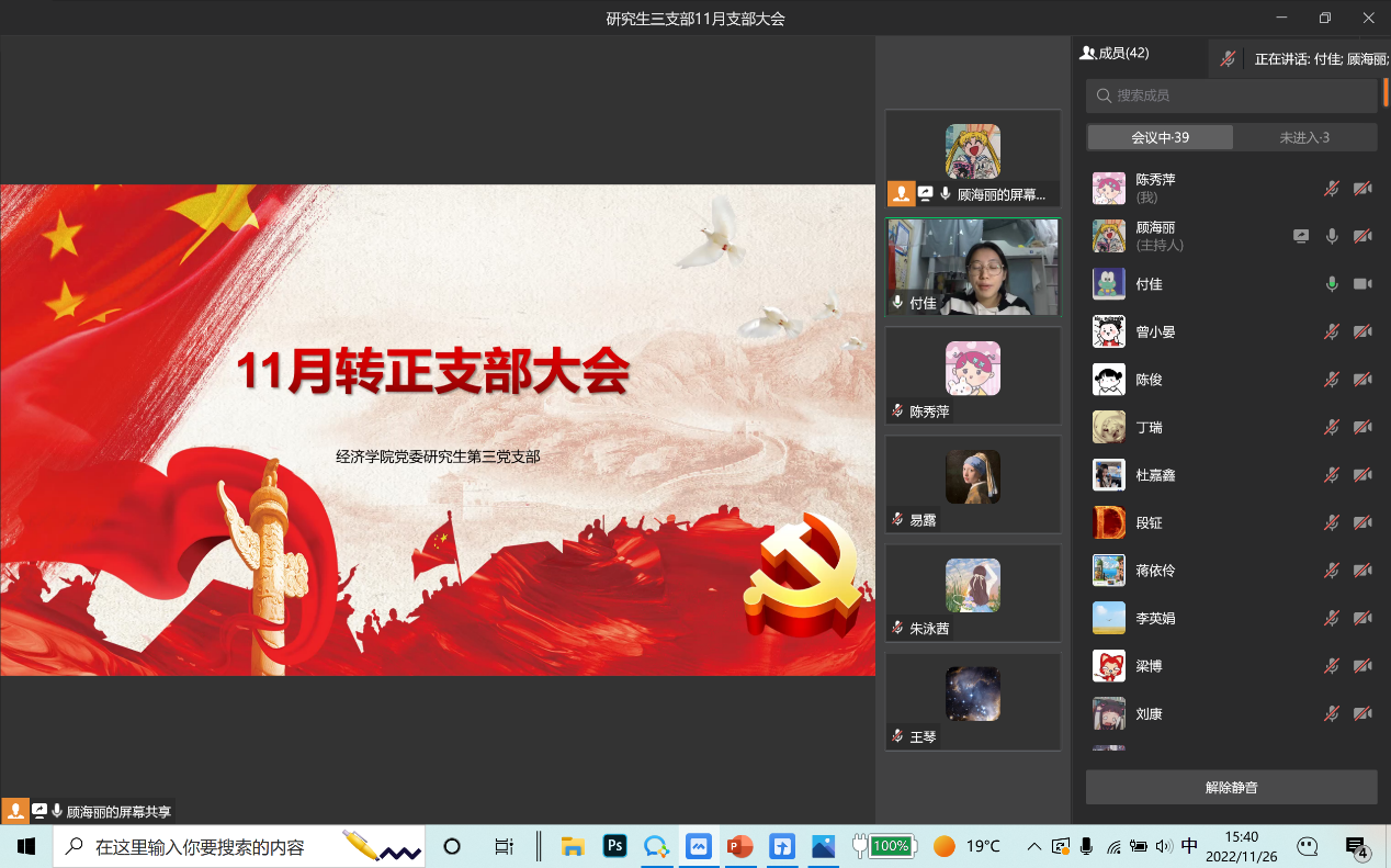 2022年11月26日,beat365官方网站研究生第三党支部通过企业微信线上会议召开了11月支部大会,会议内容包括支部书记讲党课事宜、预备党员转正以及讨论接收预备党员事宜。本次会议由支部书记薛晶月主持,研究生三支部全体党员参加。