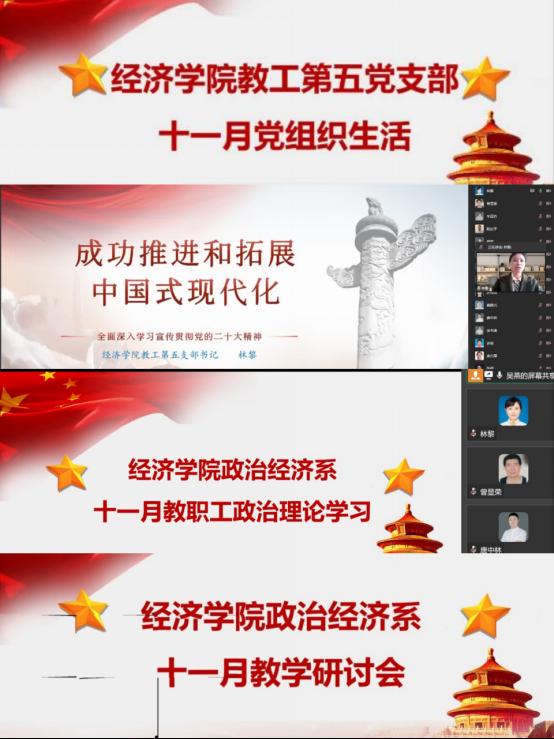 11月25日中午,beat365官方网站教工第五支部通过企业微信开展了十一月党组织生活及支部书记讲党课等活动。此次活动主要包括四个环节,党组织生活、支部书记讲党课、教职工政治理论学习和系部教学研讨会。活动由教工第五支部书记、政治经济系主任林黎主持。
