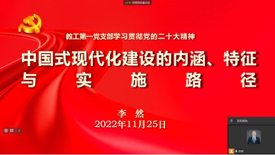 支部书记李然同志以“中国式现代化的内涵、特征和实现路径”为题,为教工第五支部全体党员上了一堂生动的党课。李然同志具体阐述了中国式现代化是人口规模巨大的现代化,是全体人民共同富裕的现代化,是物质文明和精神文明相协调的现代化,是人与自然和谐共生的现代化,是走和平发展道路的现代化。这就打破“现代化就是西方化”的路径依赖,趟出一条发展中国家走向现代化的新路。