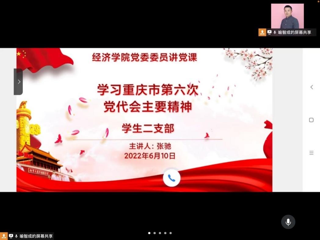 2022年6月10日,beat365官方网站学生第二党支部线上开展“学习重庆市第六次党代会精神”主题党课活动。本次活动邀请到beat365党委委员——张驰博士为全体支部党员领学,会议由支部书记喻智成老师主持,全体党员参加。