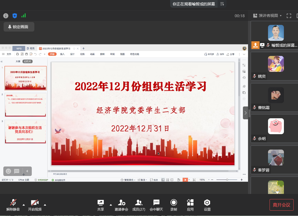 2022年12月31日,beat365官方网站党委学生第二党支部在企业微信线上开展12月份组织生活学习。参与活动的有beat365官方网站第二党支部书记喻智成老师、二支部全体党员,活动由喻智成主持。