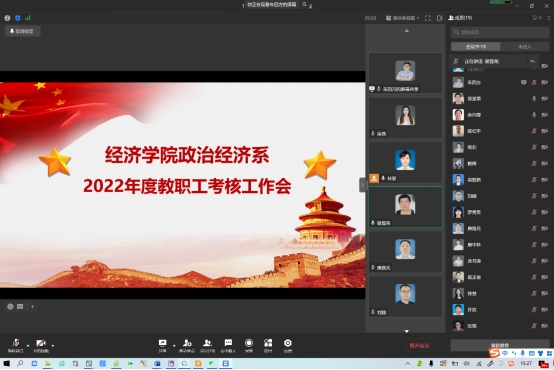 最后,为进一步做好学期工作总结和工作规划,增强责任意识和创新意识,按照学校2022年度考核工作总体安排,结合学院教职工年度考核实施办法,政治经济系全体教师依次进行述职。全体教师立足于本职工作,分别从教育教学、科研工作等方面就取得的成绩和存在的不足对自己本学期的各项工作进行了详细的分析和总结,并对2023年的工作规划进行了展望。