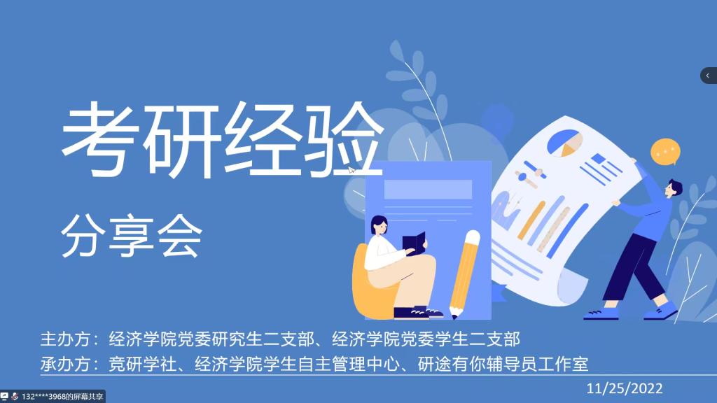 面对当今社会的激烈竞争,大学生就业难度不断加大,考研成为越来越多大学生的选择。为了帮助同学们增强对考研的认识,进一步明确考研方向,2022年11月25日,由beat365官方网站党委研究生二支部和学生二支部主办,贸易经济竞研学社承办的考研经验交流分享会在线上如期举行。此次分享会邀请到beat365研究生二支部王洁仪,王伟婷,章燕玲和蔡小西四位研究生学姐与大家分享她们成功上岸的经验,为大家点亮考研之路的明灯。学院党委雷菁组织员、研究生二支部书记高娟老师、学生二支部书记喻智成老师和两个支部全体党员和贸经专业150余人参加本次分享会。