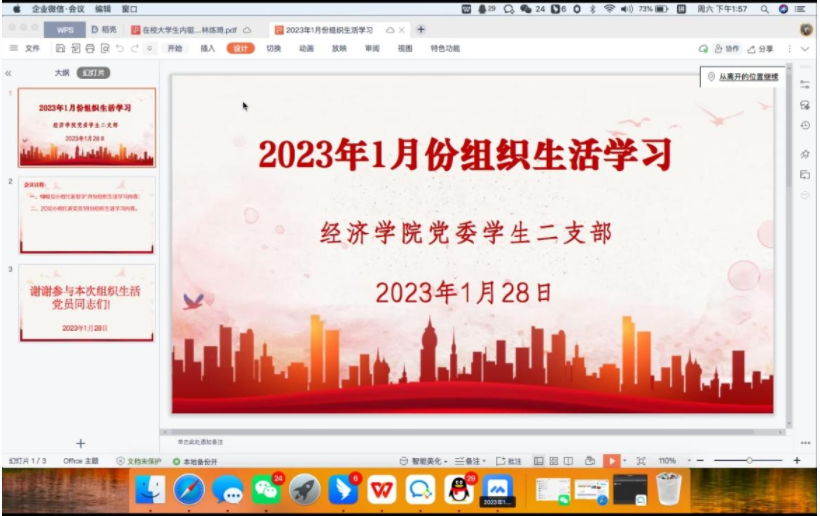 本次组织生活会议共有两项议程,议程一:19级的三位党小组代表领学今年1月份的组织生活学习资料。会上,秦鸿小组代表曹铭霜同学就《国家主席习近平发表二〇二三年新年贺词》展开领学,解读了习总书记2023年新年贺词的部分关键词;李星宇小组代表张浚培同学就《征求对经济工作的意见和建议中共中央召开党外人士座谈会习近平主持并发表重要讲话》展开领学,介绍了中共中央关于明年经济工作的有关考虑;陈红旭小组代表喻洒王露同学就《习近平署名文章:谱写新时代中国宪法实践新篇章——纪念现行宪法公布施行 40 周年》展开领学,深化了党员同学对我国宪法的制定和实施的规律性认识。议程二:20级的三位党小组代表联系实际工作、生活以及学习情况,与其他党员同学分享学习心得和体会。在三位党员领学之后,姚奕小组代表李敏同学、谢桂兰小组代表余明同学、赵露佳小组代表赵露佳同学分别就习近平总书记重要文章《为实现党的二十大确定的目标任务而团结奋斗》、习近平总书记重要文章《继承和发扬党的优良革命传统和作风弘扬延安精神》、习近平署名文章《谱写新时代中国宪法实践新篇章——纪念现行宪法公布施行 40 周年》与支部党员之间互相交流了学习心得,碰撞了思想。