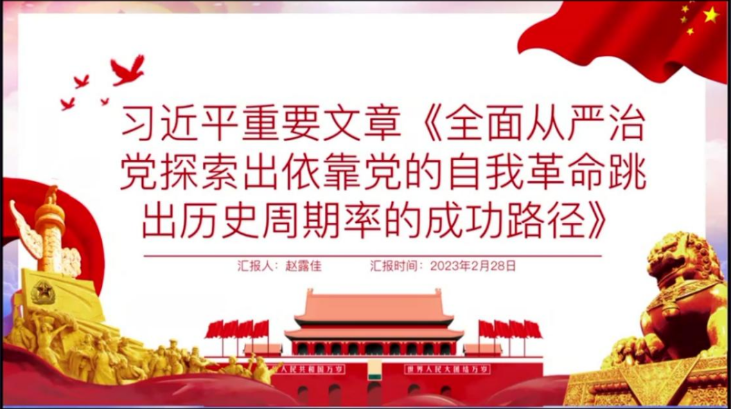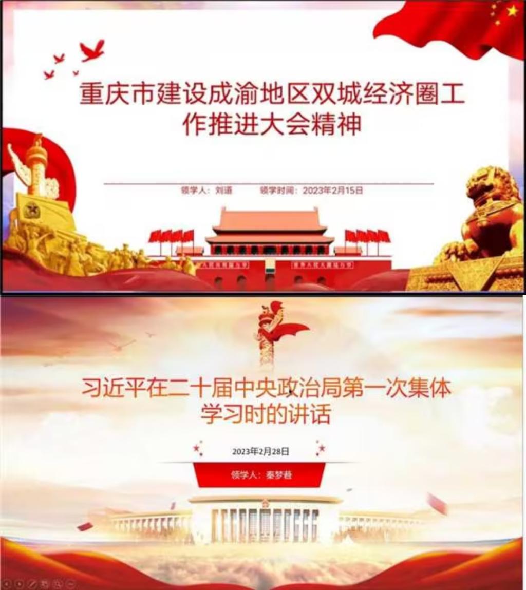 本次会议采用分年级分班级党小组领学和交流学习心得方式。会上,20贸经一班党小组代表刘道同志就《重庆市建设成渝地区双城经济圈工作推进大会精神》展开领学,向所有同志们讲述了此次推进大会精神的相关内容,并聚焦“两中心两高地”战略定位,以建成高质量发展高品质生活新范例为统领,打造具有全国影响力的科技创新基地;20贸经二班党小组代表秦梦莙同志就《习近平:在二十届中央政治局第一次集体学习时的讲话》展开领学,介绍了以全党做示范,在全面学习上下功夫、在全面把握上下功夫、在全面落实上下功夫;20贸经三班代表赵露佳同志就《习近平重要文章:全面从严治党探索出依靠党的自我革命跳出历史周期律的成功途径》展开领学,深化了同志们对跳出历史周期律成功途径的研究。19级的3位党小组代表联系实际工作、生活以及学习情况,与其他同志们分享学习心得和体会。19贸经一班小组代表张利同志、19贸经二班代表白菲菲同志、19贸经三班小组代表杨诗琪同志分别就《市委常委会1月28日会议精神 学习贯彻习近平总书记重要指示精神》、《习近平在二十届中央纪委二次全会上的重要讲话精神》、《习近平在二〇二三年春节团拜会上的讲话》就自己的学习心得与支部党员之间进行了交流。