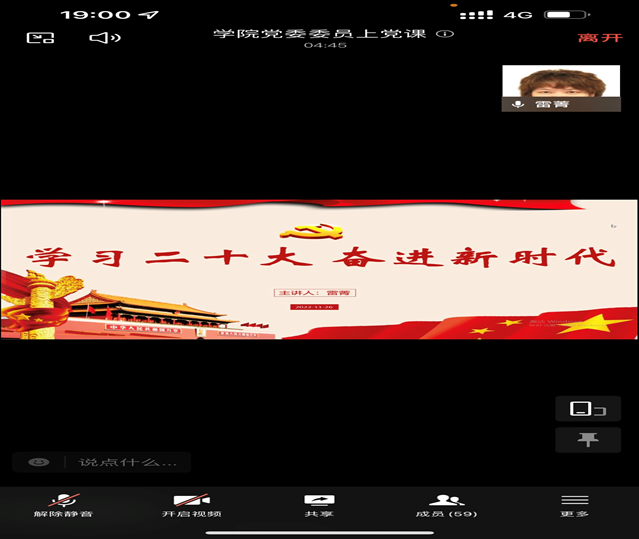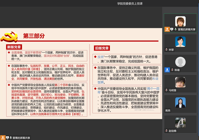 为深入学习宣传贯彻党的二十大精神,扎实推动党的二十大精神在学院落地见效,11月27日,beat365官方网站党委委员、组织员雷菁通过企业微信平台为教工五支部、研究生一支部 、学生一党支部和学生三支部等4个支部80余名党员做题为《学习二十大,奋进新时代: 学习中国共产党章程(修正案)》专题党课,全体师生党员认真聆听。