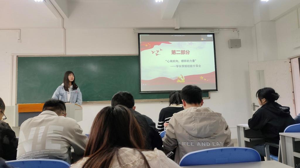 其次,在“心有所向,榜样的力量”支部特色活动中,由研三的学长学姐进行学习和工作方面的经验分享。李思林学姐分享了研究生开题及毕业论文写作方面的经验,她指出,对于毕业论文的写作要早作准备,前期多查阅相关文献,找到创新的选题,着手开始写作,查找数据的过程要有足够的耐心,多与同学和老师沟通。朱洋洋学长分享了申博、考博相关经验,他强调,有读博意向的同学应该多参与课题研究、论文写作,找到攻读博士期间的研究方向,丰富自己的科研经历。