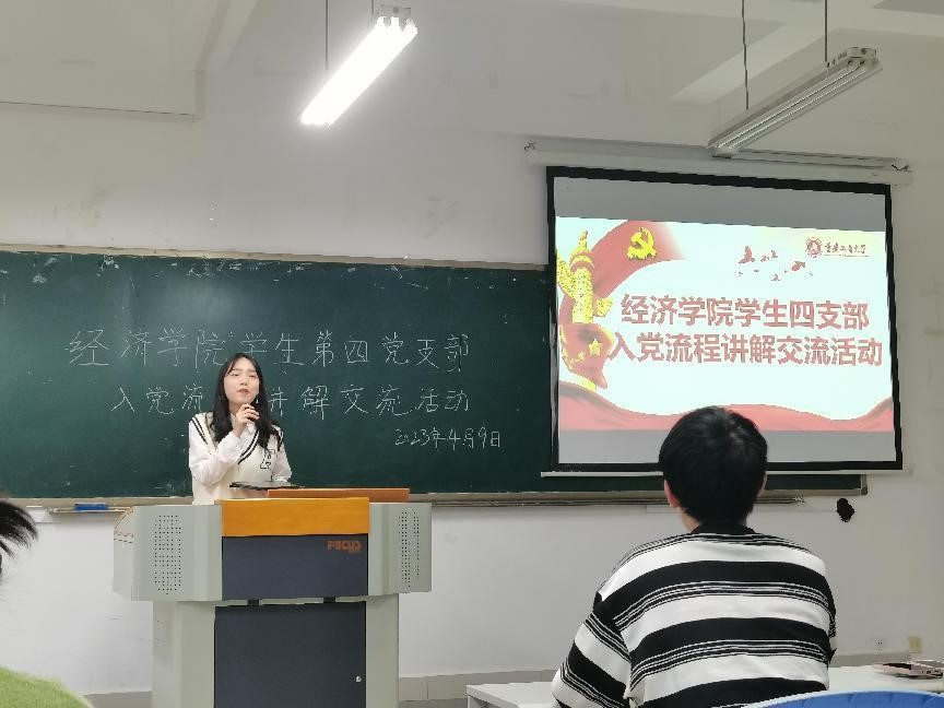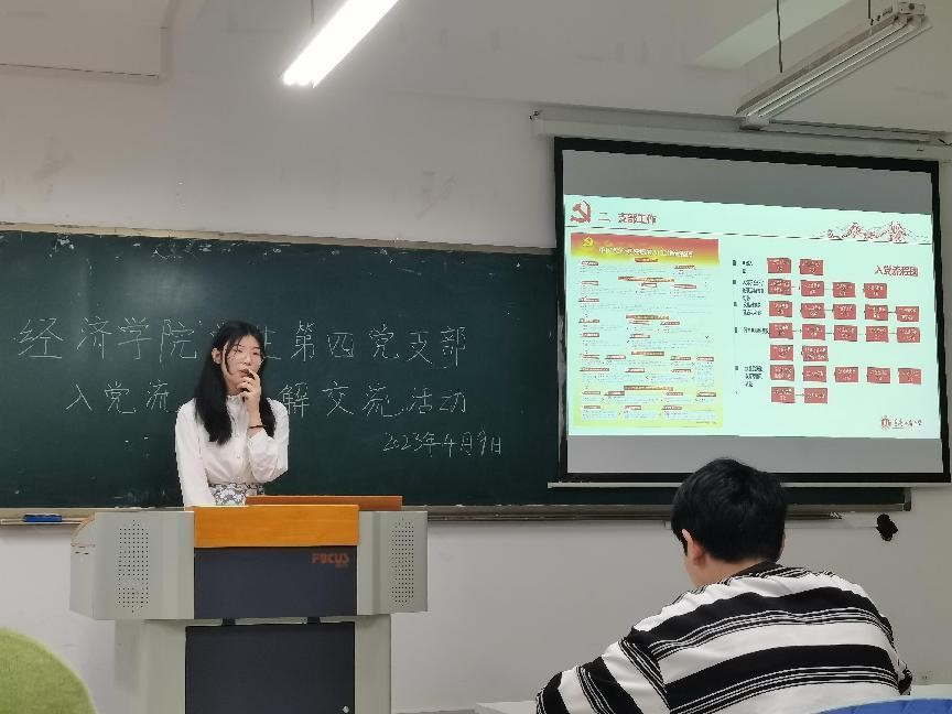 活动伊始,支部负责党员发展工作的马雯钰同志针对目前大家比较关心的入党事宜,向同学们详细介绍了入党的基本流程,重点解答了同学们对于入党申请书的书写与递交问题,入党积极分子的确定与培养教育工作以及发展对象的后续考察等问题。同时,马雯钰同志也强调入党是郑重、严肃的事情,同学们应当进一步强化自身认识,端正自己的入党动机,秉持正确的理想信念。随后,支部负责活动开展的秦怡同志从支部的构成,支部的工作和支部的活动三个方面对组织进行了简单的介绍。同时也期待有新的活力注入到第四党支部中来。在自由提问环节,支委张清阳同志和支部负责入党积极分子工作的李泽琪同志从面试环节,志愿服务,党员考核多方便解答了现场提出的疑惑,进一步明晰了同学们的努力方向和前进的目标。活动还邀请专门邀请了支部党员19级财政学专业刘梦婷学姐从考研的专业储备,注重科研成果,英语听力等角度为准备考研的同学答疑解惑。