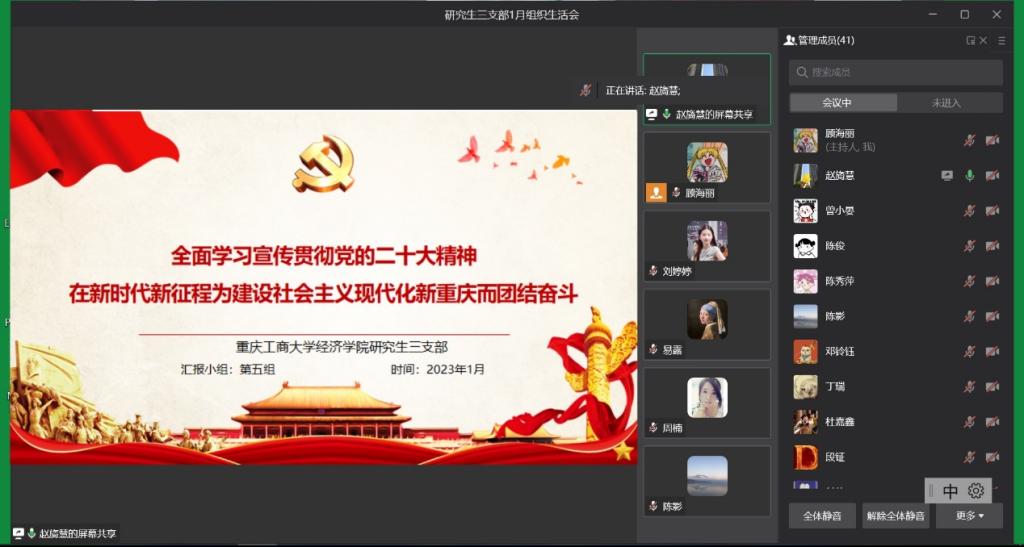 2023年1月13日下午,beat365官方网站研究生第三党支部在企业微信线上会议室开展了1月组织生活会,深入学习中国共产党重庆市第六届委员会第二次全体会议内容。本次会议由支部书记薛晶月主持,研究生第三党支部全体党员参加。