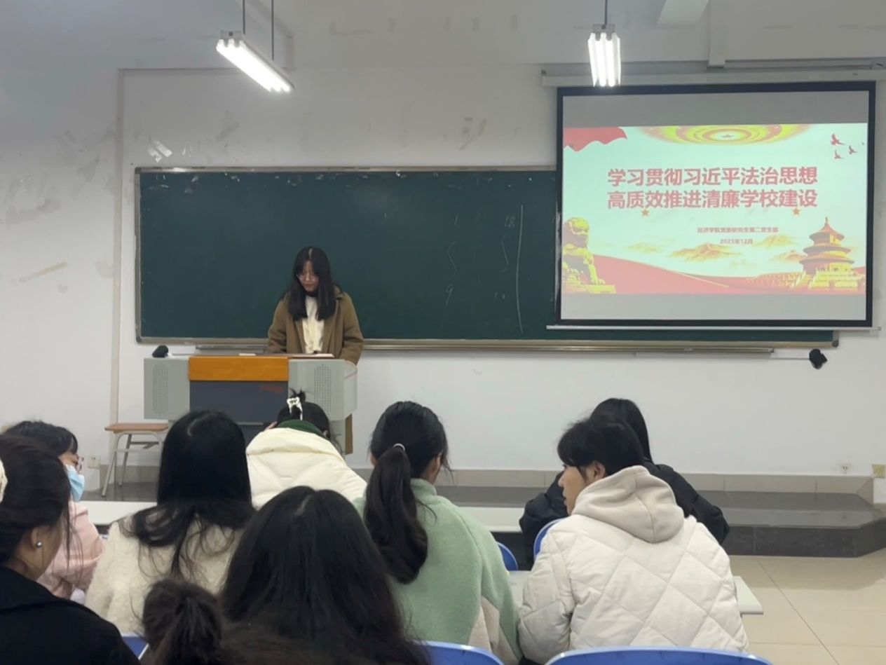 全体党员集体认真学习了由匡艳同志分享的以“学习贯彻习近平法治思想,高质效推进清廉学校建设”为主题的组织生活内容。强调贯彻落实习近平总书记重要精神指示,不断推进教育领域党风政风、教风学风优化升级,促进风清气正良好教育生态和育人环境的形成,让“清廉学校”成为落实“立德树人”根本任务的重要保障,奋力打造清廉的教育高地。通过深入学习,全体党员同志深刻的认识到习近平法治思想在教育领域的重大意义,作为一名学生党员,我们需增强思想自觉、政治自觉、行动自觉。