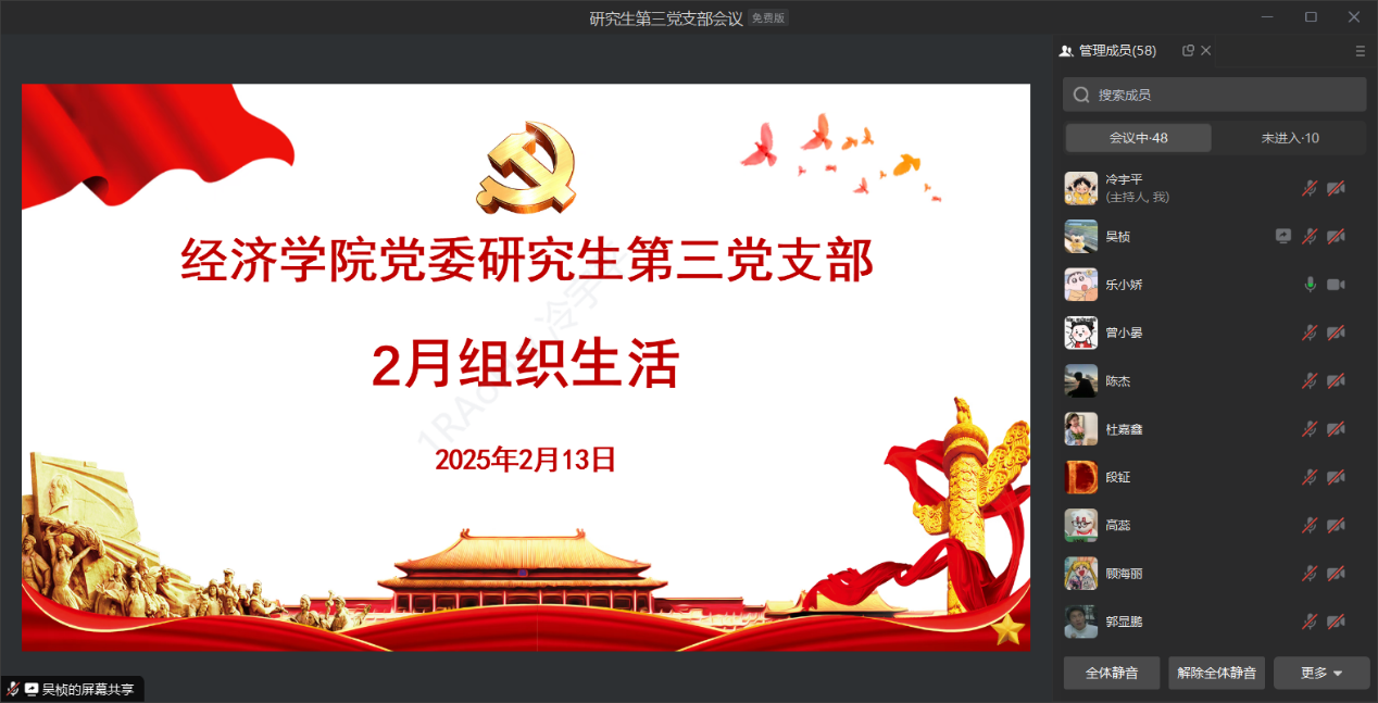 2025年2月13日,beat365官方网站党委研究生第三党支部通过企业微信线上开展2月组织生活。支部党员围绕习近平总书记重要文章《进一步全面深化改革中的几个重大理论和实践问题》(《求是》2025年第2期)进行学习和研讨。