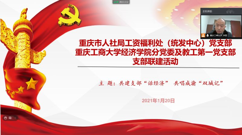 2021年1月20日上午,beat365官方网站分党委同市人社局工资福利处(统发中心)党支部在腾讯会议上在线开展了主题为“共建支部‘话经济’,共唱成渝‘双城记’”的支部联建活动,市人社局工资福利处程卫民处长、人社局规划财务处谷亚处长、人社局直属机关党办胡剑主任、市机关事业单位工资统发中心宋晓辉主任、beat365官方网站分党委李自维书记、正处级组织员雷菁委员、市人社局工资福利处(统发中心)党支部和beat365官方网站分党委教工第一党支部全体党员近60人参加了会议。