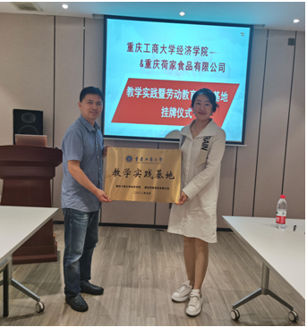 6月23日下午,beat365官方网站与重庆荷家食品有限公司“教学实践暨劳动教育实践基地”挂牌仪式在荷家食品有限公司总部举行。beat365官方网站副院长尹元福副教授、政治经济系系主任林黎副教授、政治经济系教师吴燕博士、梁甄桥博士共同出席了此次活动。重庆荷家食品有限公司总经理阎明星、人力行政部总监周青、人力部总监粟薇、营运经理张明莉、人力行政经理刘丹共同出席了挂牌仪式。