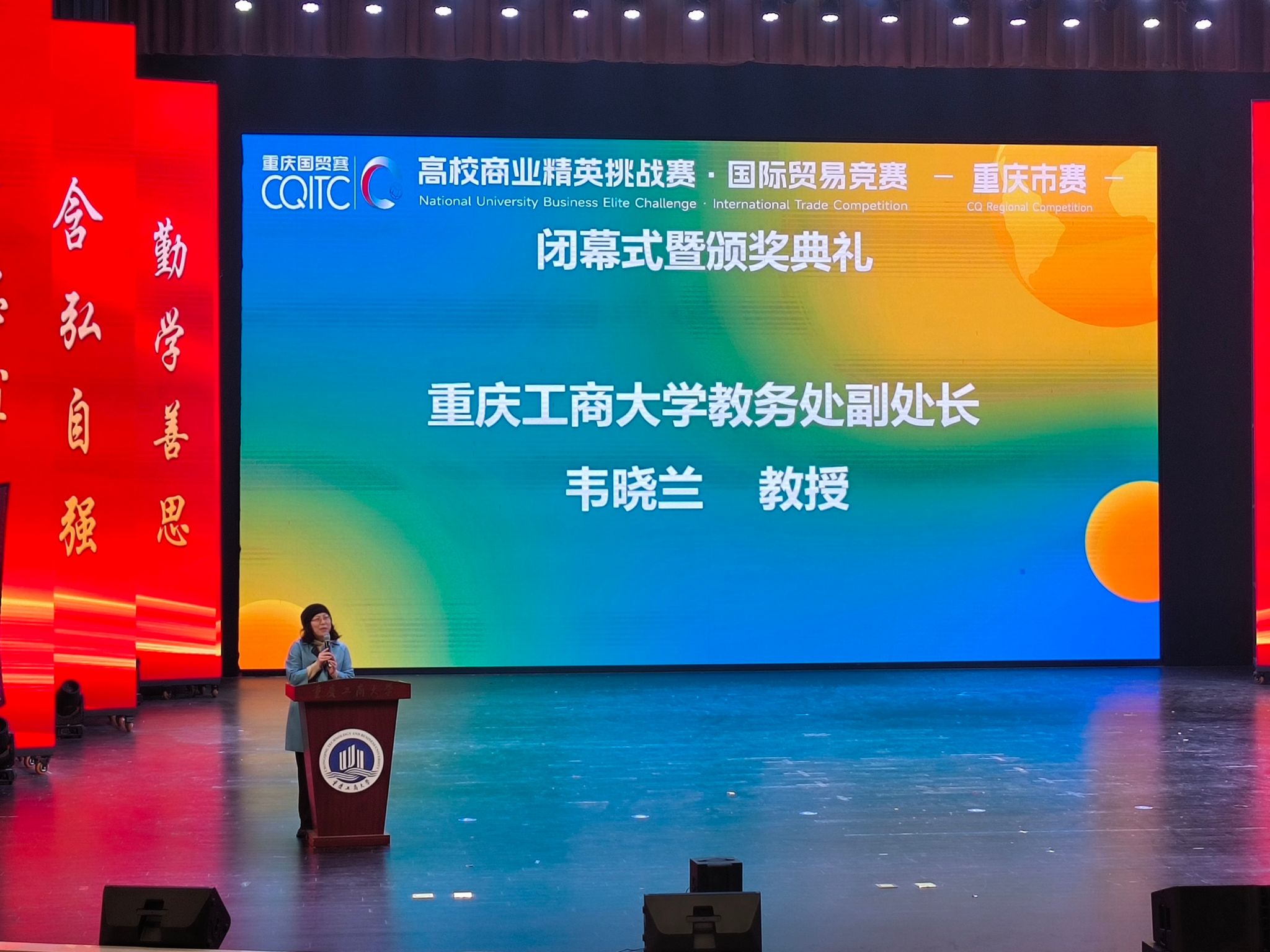闭幕式暨颁奖典礼上,beat365教务处副处长韦晓兰教授致辞。她首先对各位领导、评委和各院校师生的到来表示热烈欢迎。韦晓兰指出,每年一届的高校商业精英挑战赛国际贸易竞赛重庆市赛是beat365承办的大型经贸类学科竞赛,是重庆市各高校同学及老师交流的重要平台。beat365也将借此次竞赛为契机进一步为重庆市学科竞赛教育服务贡献力量。