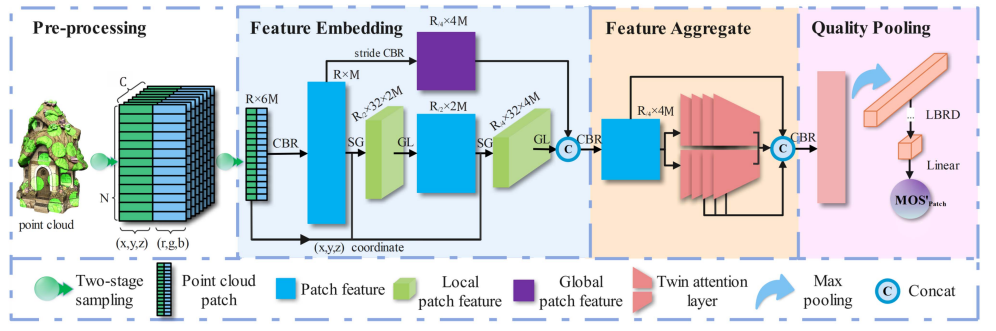 《3DTA: No-Rference 3D Point Cloud Quality Assessment With Twin Attention》发表于IEEE Transactions on Multimedia,第一作者是2022级研究生朱琳霞,通讯作者是苏洪磊。此研究提出了一种基于双重注意力机制的Transformer模型,用于端到端预测点云感知质量。该方法设计了两阶段采样策略,有效提取代表整幅点云的几何和纹理信息,并采用双注意力模块(空间注意力和通道注意力)增强模型对失真的感知能力,从而直接输出点云的主观质量评分。实验结果表明,与以往方法相比,3DTA模型在大部分情况下显著提升了无参考质量评价的准确性,其性能甚至可与部分全参考指标相媲美。这一模型结构简单灵活、适用范围广,为无参考PCQA提供了高精度的解决方案。提出的模型结构如图1所示。