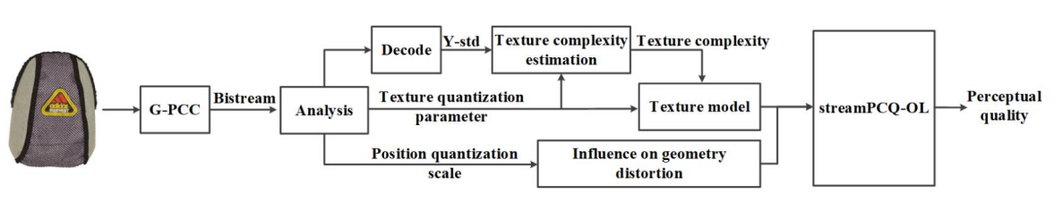 《No-Reference Bitstream-Based Perceptual Quality Assessment of Octree-Lifting Encoded 3D Point Clouds》发表于IEEE Transactions on Visualization and Computer Graphics,第一作者是2021级研究生吕剑雨,通讯作者是苏洪磊。针对传统的点云质量评价方法需要完整解码点云的问题,本研究提出了一种无参考比特流层质量评价模型streamPCQ-OL,专门用于评价Octree-Lifting编码的3D点云质量。该模型直接从压缩后的比特流中提取关键特征,通过分析纹理量化参数、几何量化尺度等信息,评价点云的几何和纹理失真。与传统方法不同,streamPCQ-OL无需解码完整点云即可实时提供质量评价结果,显著提升了评价的效率。提出的结构图如图2所示。