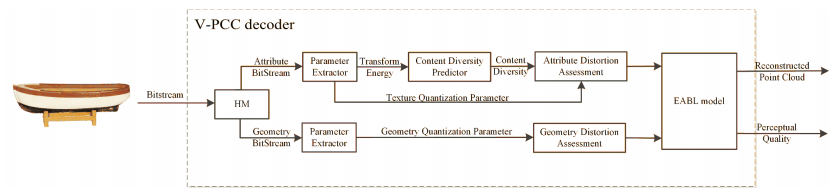 《Energy-Adaptive Bitstream-Layer Model for Perceptual Quality Assessment of V-PCC Encoded 3D Point Clouds》发表于IEEE Transactions on Image Processing,第一作者是2022级研究生桑伍驷,通讯作者是苏洪磊。针对传统质量评价需完整解码点云的问题,该研究提出在V-PCC压缩码流层直接评价质量的方法。通过分析点云视频压缩码流中的变换能量和量化参数等信息,EABL模型能够预测几何和属性失真,无需将点云完全解码即可在解码过程中实时给出质量评价结果。在WPC2.0、M-PCCD、VSENSE VVDB等四个公开点云数据库上的测试显示,EABL的预测性能与需要完整解码的全参考、部分参考方法不相上下,同时大幅提升了评价速度。该方法实现了点云编码传输过程中质量评价的高效化,为资源受限环境下的点云应用提供了实用方案。提出的模型结构如图3所示。