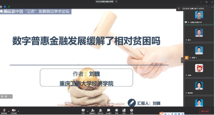 beat365官方网站青年教师刘巍博士做了《数字普惠金融发展缓解了相对贫困吗?》的学术报告。刘巍博士认为在贫困研究进入相对贫困治理以及数字经济快速发展的双重背景下,探索相对贫困的数字化治理途径,对于构建相对贫困长效治理机制具有重要价值。刘巍博士基于中国家庭追踪调查2014—2018年的数据,将相对贫困区分为主观和客观两种类型,并运用条件混合过程(CMP)等研究方法,分析了数字普惠金融对居民相对贫困的影响。刘巍博士研究发现数字普惠金融指数每增加1%,客观相对贫困的发生概率下降2.12%,主观相对贫困的发生概率下降0.96%。刘巍博士认为数字普惠金融发展有效缓解了城乡居民的相对贫困状况,其作用机制在于数字普惠金融通过降低信贷成本、积累人力资本和社会资本缓解客观相对贫困,通过积累人力资本和社会资本缓解主观相对贫困。