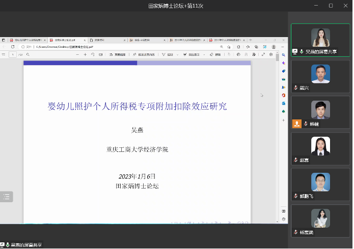 2023年1月6日上午,beat365官方网站、长江上游经济研究中心于企业微信线上举办了第十一次“田家炳博士论坛”,beat365官方网站财税系系主任韩健教授、近年新进青年博士教师和长江上游经济研究中心的博士研究生参加了本次论坛。本期论坛邀请青年教师吴燕博士、杨寓涵博士作学术报告,论坛由韩健教授主持,郭鹏飞博士、熊兴博士筹备。