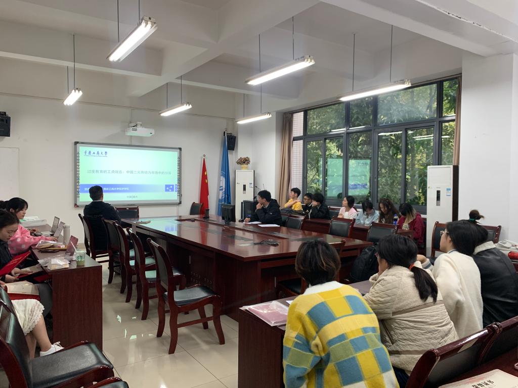 活动第三个环节,由许岩副教授向大家分享了自己的论文《过度教育的工资效应:中国二元劳动力市场中的分异》。许岩老师为大家讲解了该文的思路脉络,着重阐述了论文研究中运用到的理论基础、数据来源、模型选择、变量设定、实证结果及微观机制等内容,以及自己在写作过程中遇到的困难。随后,同学们就变量选取、实证分析等方面提出自己的疑惑,许老师一一作答并与大家深入交流文章有待改进的地方。