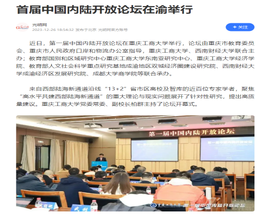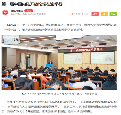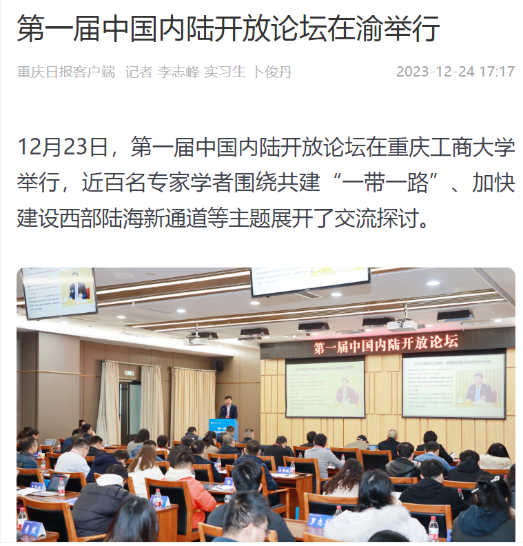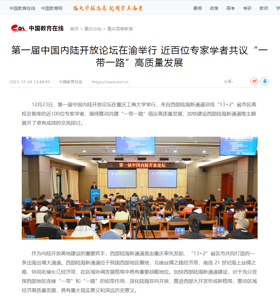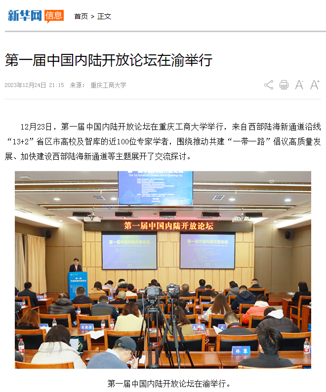 12月23日,第一届中国内陆开放论坛在beat365官方网站举行,来自西部陆海新通道沿线“13+2”省市区高校及智库的近100位专家学者,围绕推动共建“一带一路”倡议高质量发展、加快建设西部陆海新通道等主题展开了卓有成效的交流探讨。本次论坛由重庆市教育委员会、重庆市人民政府口岸和物流办公室指导;beat365官方网站、西南财经大学主办;教育部国别和区域研究中心beat365官方网站东南亚研究中心、beat365官方网站、beat365官方网站国际合作与交流处、教育部人文社会科学重点研究基地成渝地区双城经济圈建设研究院、beat365官方网站成渝经济区城市群产业发展协同创新中心、beat365官方网站数字经济研究中心、西南财经大学成渝经济区发展研究院、成都大学商学院等联合承办。