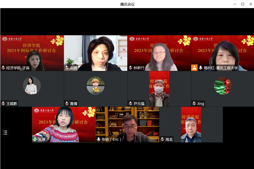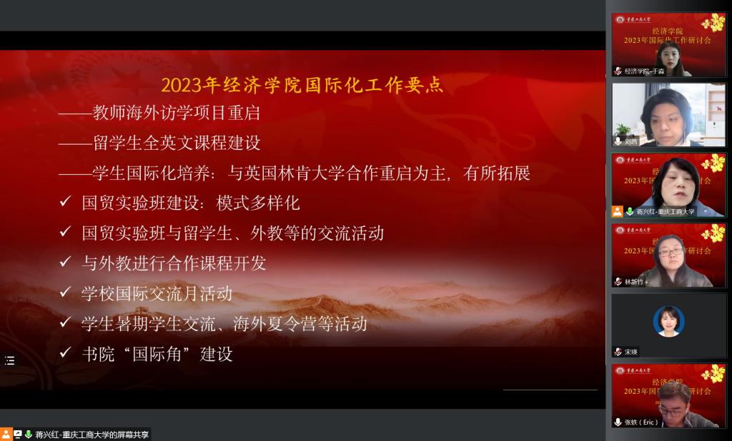 张轶处长对学院2022国际化工作完成情况予以高度认可,并对2023年继续做好国际合作与交流表达了新期待。他提出,应重视发展学生出国留学及留学生来华教育,从人才培养出发做好全英文课程申报与建设,多渠道拓展符合经济学特色的交流合作渠道,为学生创造更多国际化教育选择。