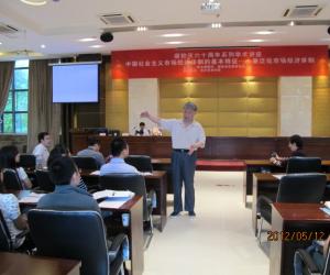 王潼老师首先总结了中国经济在改革开放30多年来飞速发展取得的辉煌成就,并由此引出其所提出的“经济惯性理论”——经济学中的牛顿定律。王老师从物理学角度阐述了人们在经济活动中的惯性运动,结合微积分知识与现实案例揭示经济流量与经济存量的运动关系。之后,他用绘图的形式向大家介绍了简明的社会物质和精神财富的生产的经济学动力系统,导出有社会(固定)资产函数。王老师结合物理动力学公式“F=ma”,得出经济活动中经济体有各自的质量和惯性的结论,并指出经济活动中广泛存在着各种时滞正是经济惯性的现实表现。王潼老师指出:经济惯性理论是“摸着石头过河”的经济体制改革战略的经济学理论基础。在论证这一部分时,王老师结合计划经济体制国家和市场经济体制国家的不同经济惯性,以改革的成本高低、效益多少为评判标准,通过对比中俄两国的经济改革历程和发展成果,研究得出一国的经济改革要适合国家的经济惯性的结论。他批判了严重剥削低收入的普通民众并给经济发展带来巨大伤痛的“休克疗法”,指出中国“摸着石头过河”的改革开放才是更适合国家经济惯性的发展战略。