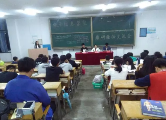 接下来贺金鹏师哥绘声绘色的向同学们讲述了自己大二在宁波大学学习的经历,然后让同学们在黑板上写出自己对于考研的问题和困惑,并就为什么要考研、如何选择学校、专业复习与考试等问题为在座的每位同学做了详细讲解。重点从专业课、数学、学校调剂三方面为同学们做了全面、详实的分析。