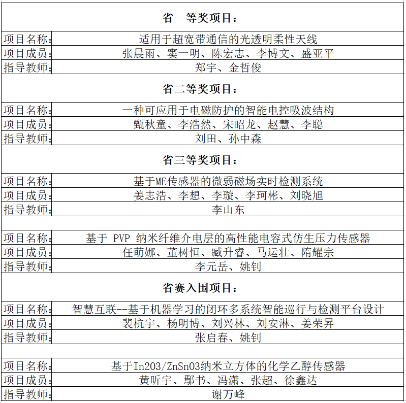 近日,在刚结束的第九届山东省大学生科技创新大赛中,学院参赛项目表现优异,取得大丰收,获得省级一等奖1项、二等奖1项、三等奖2项,省赛各奖项获奖数量均位居学校各学院部第一名。其中,郑宇老师指导、张晨雨同学主持的“适用于超宽带通信的光透明柔性天线”项目荣获大赛一等奖。另有米兰milan和潍坊学院合作的“轨安卫士”项目也获得省一等奖。我校本届赛事共获得省级一等奖3项、二等奖4项、三等奖8项。