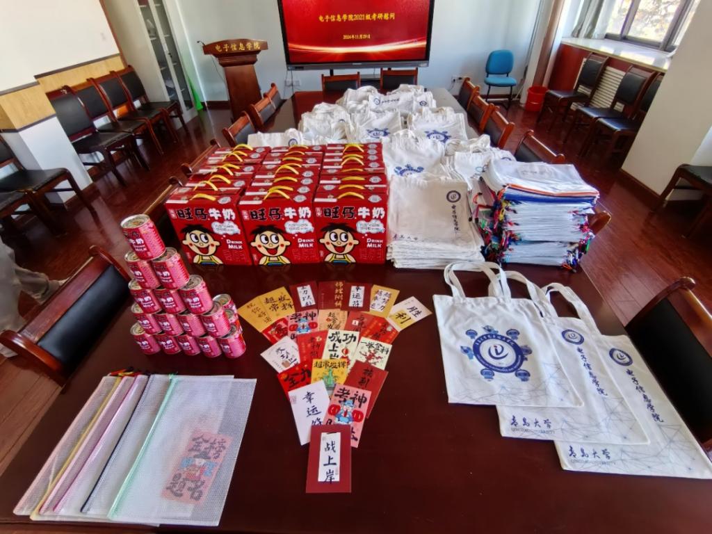 学院为考研学子精心准备了“助梦能量包”,装有祝福贺卡、文具袋、定制帆布包、旺仔牛奶等物资,寓意 “‘旺’学苦研登榜首,桂冠殊荣耀门楣”。