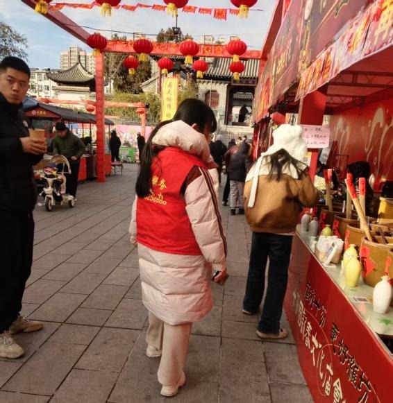 第四站,实践团成员来到坊市奎文区十笏园景区进行志愿服务。在商业街开街前,我们帮助商家搬运货物、摆放商品展示架,确保店铺能按时、有序开业。同时,与商家一同清扫店铺门前区域,营造整洁的营业环境。在高峰时段,成员们在主要路口和拥堵地段协助疏导人流,引导顾客有序通行,避免发生拥挤碰撞事件。