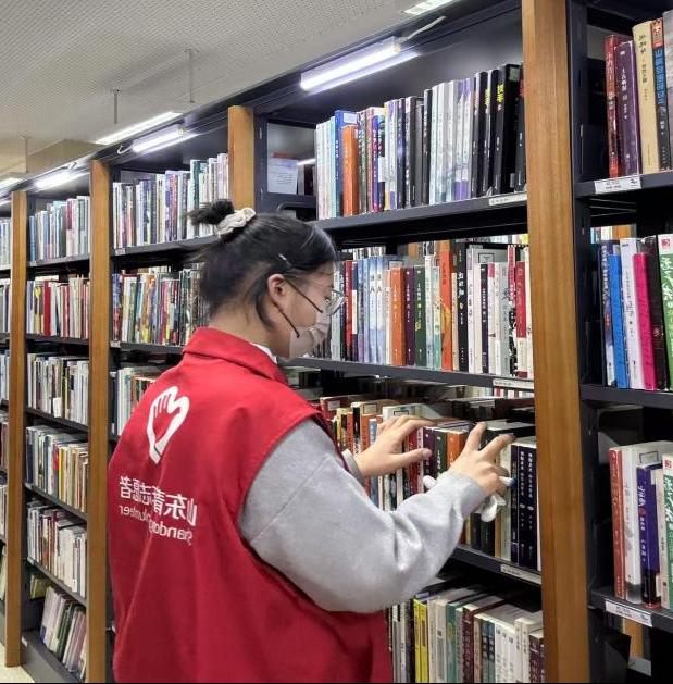 第二站,实践团走进济南市历城区济南图书馆进行志愿服务。成员们将读者归还的书籍按照分类号归位到相应的书架上,并对书架上的书籍进行整理和排序,方便读者查找。在整理书籍的同时,我们还会主动向一些正在借阅书籍的读者宣传正确的还书方式和图书馆的借阅规则,引导他们养成良好的借阅习惯。