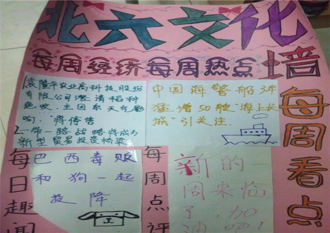 如果说上学期北六栋文化墙建设推出的“心灵驿站”、“聆听之际”、“头脑风暴”、“神马看点”、“你的建议”等精彩板块是给同学自由表达的空间,充分发挥她们的才思,那么这学期的文化墙建设推出的“每周看点”则是全方位的开阔同学的视野,帮助同学养成独立思考的习惯,丰富同学的生活。