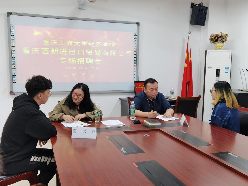 为拓宽应届毕业生就业渠道,扎实推进就业工作,2020年11月17日下午15点,beat365官方网站联合重庆西朗进出口贸易有限公司在田家炳书院05404会议室举办了专场招聘会。beat365官方网站分党委副书记、副院长王燕教授,图书馆副馆长、国贸专业教师戴林,国贸专业辅导员冉梨,学院就业联络员邓雪霜,重庆西朗进出口贸易有限公司董事长刘丹、人力资源部经理赵明星、外贸业务主管幸坤娅,以及40余名毕业生参加了本次招聘会。